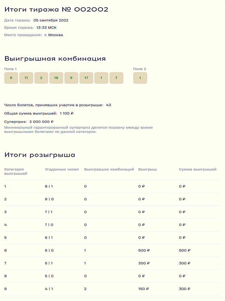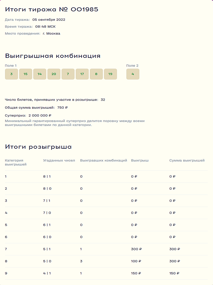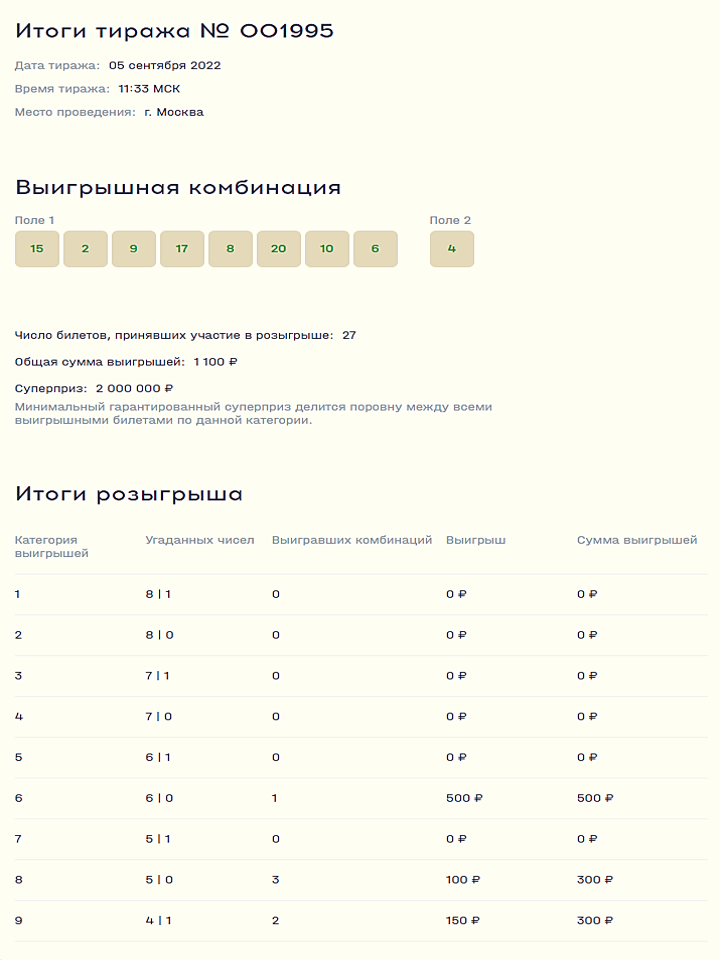 Национальная лотерея – новая государственная лотерея. Участвуя в Национальной лотерее, Вы вносите вклад в развитие социальных проектов России и оказываете поддержку российскому спорту. Ознакомьтесь с результатами тиражей и участвуйте в следующих розыгрышах на сайте Национальной лотереи.