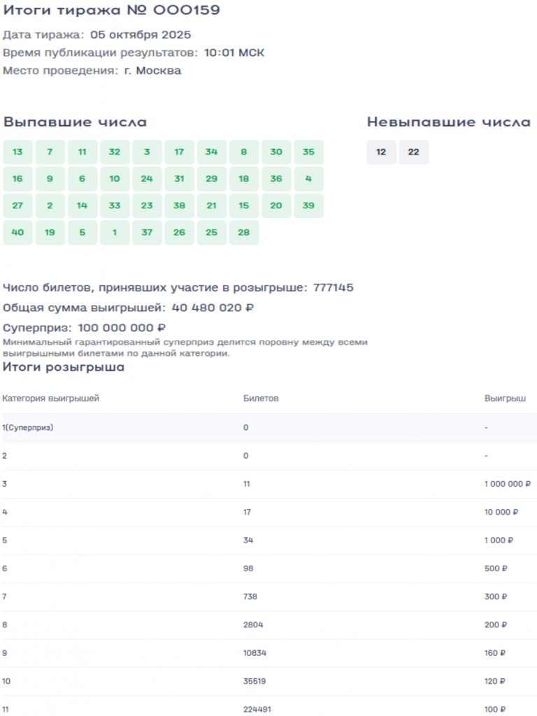 Результаты тиража № 000159 лотереи «Мечталлион», состоявшегося 5 октября 2025 года