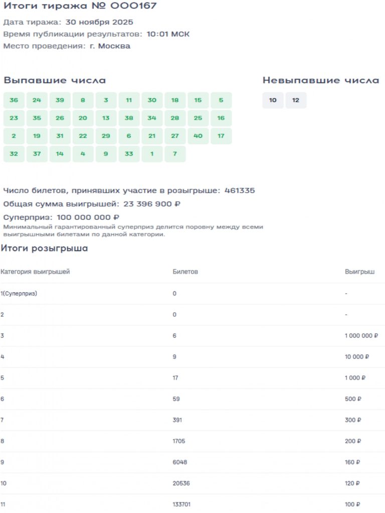 Результаты тиража № 000167 лотереи «Мечталлион», состоявшегося 30 ноября 2025 года